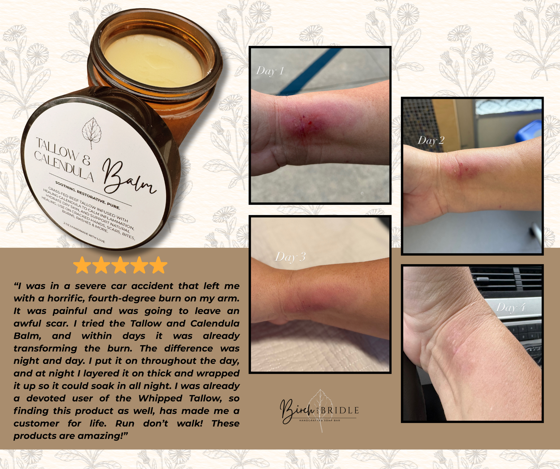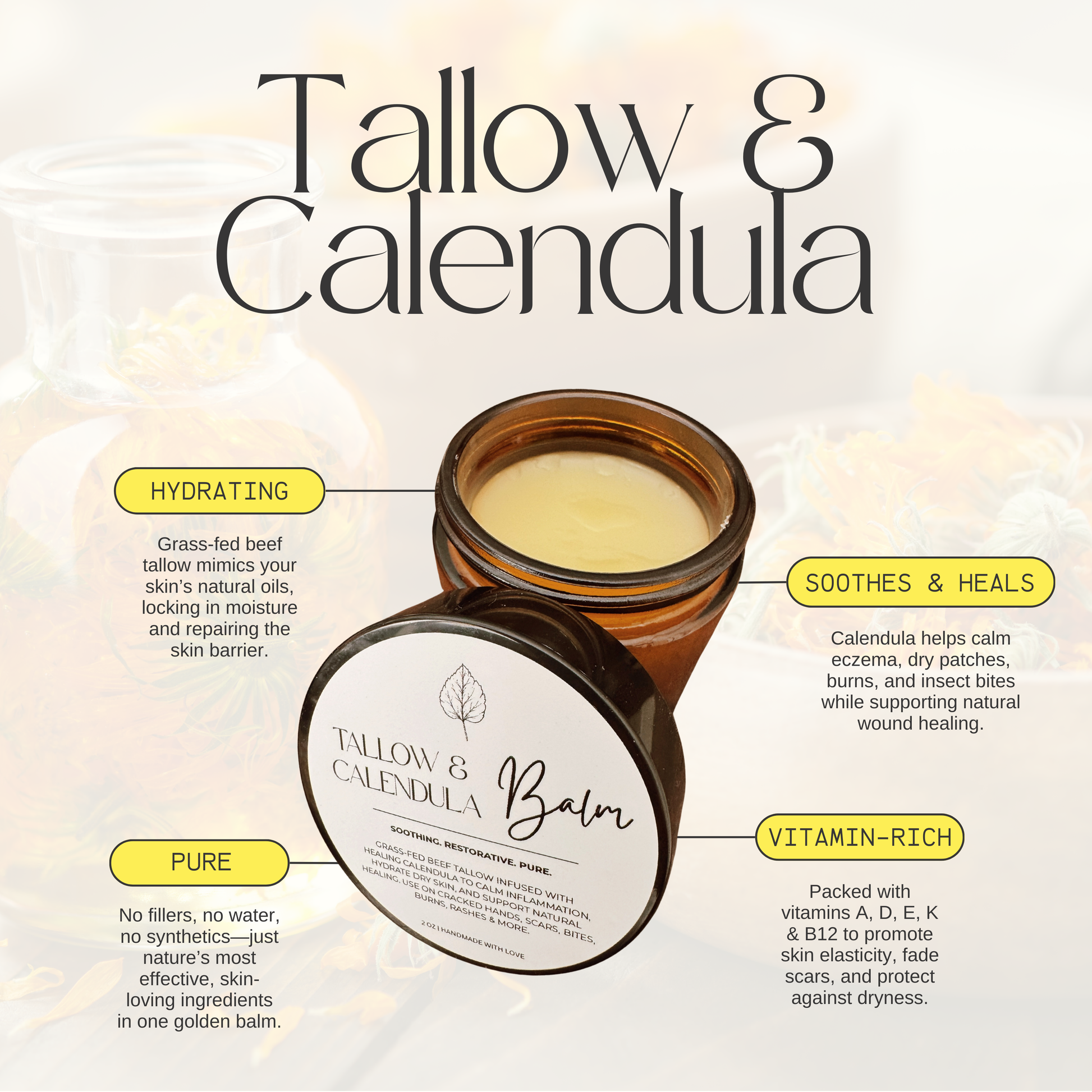 Rich, buttery, and deeply comforting — this balm is slow-infused with calendula petals for maximum skin benefits. Grass-fed tallow provides long-lasting hydration, while calendula works to calm inflammation, ease irritation, and support natural healing. Perfect for dry patches, cracked hands, eczema-prone areas, and skin that needs a little extra love.